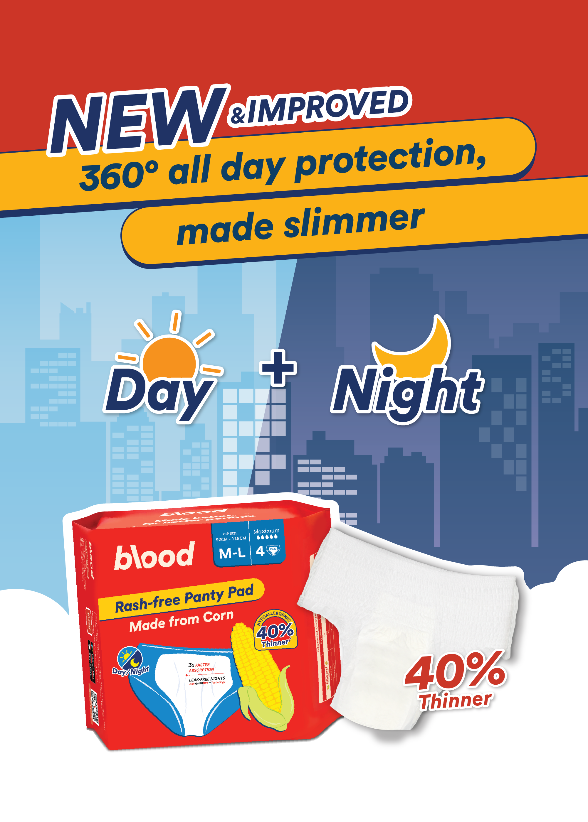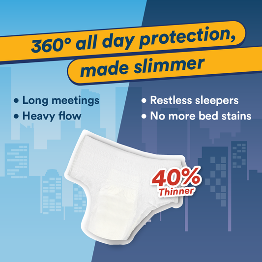 Stay worry-free with our 100% Corn topsheet and GushDry™ Anti-Leak Japanese core. They work in tandem to quickly capture sudden gushes, keeping you dry all day long